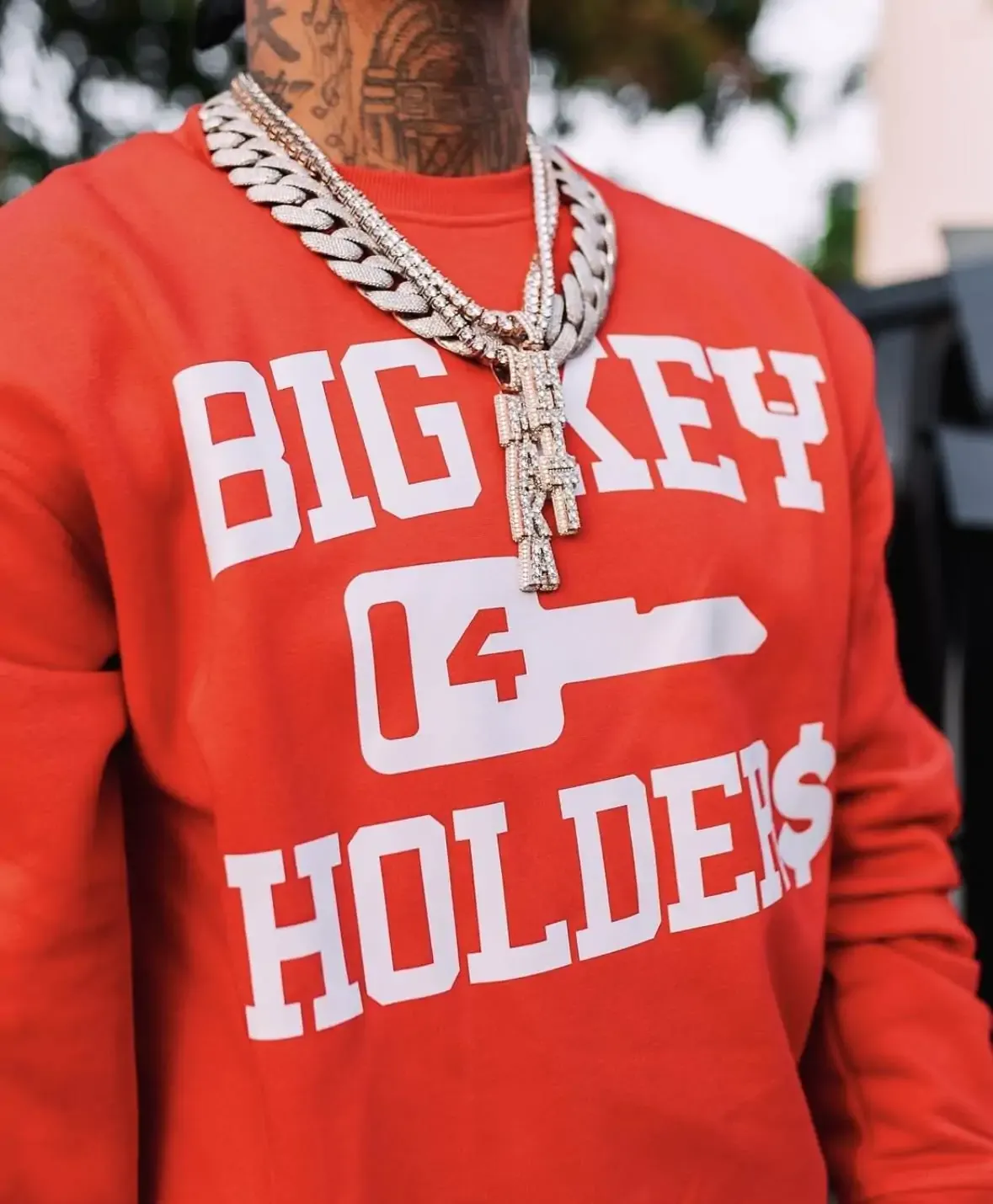 Inspired by the iced-out key pendant, the Big Key Holder – Red T-Shirt is a must-have for streetwear enthusiasts. Featuring a premium print of the iconic key design, this tee is made with high-quality fabric to keep you looking fresh all day. Whether you’re rocking it casually or layering it for a street-style fit, this piece brings attitude and luxury together.